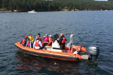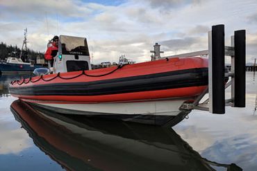 Vortex is equipped with AIS, VHF, Plotter and depth sounder (inshore use only), and has stern and bow tow posts. Her durable WING tubes are foam filled and rugged. Vortex can be transported by truck and trailer, or towed behind Zephyr. Vortex is quiet and fast, with a top speed of 45 knots, and the deep V hull makes a very comfortable ride. A push-bar can be attached to the bow when needed. The push bar also has ladder rungs which helps for passenger pick-up from shore.